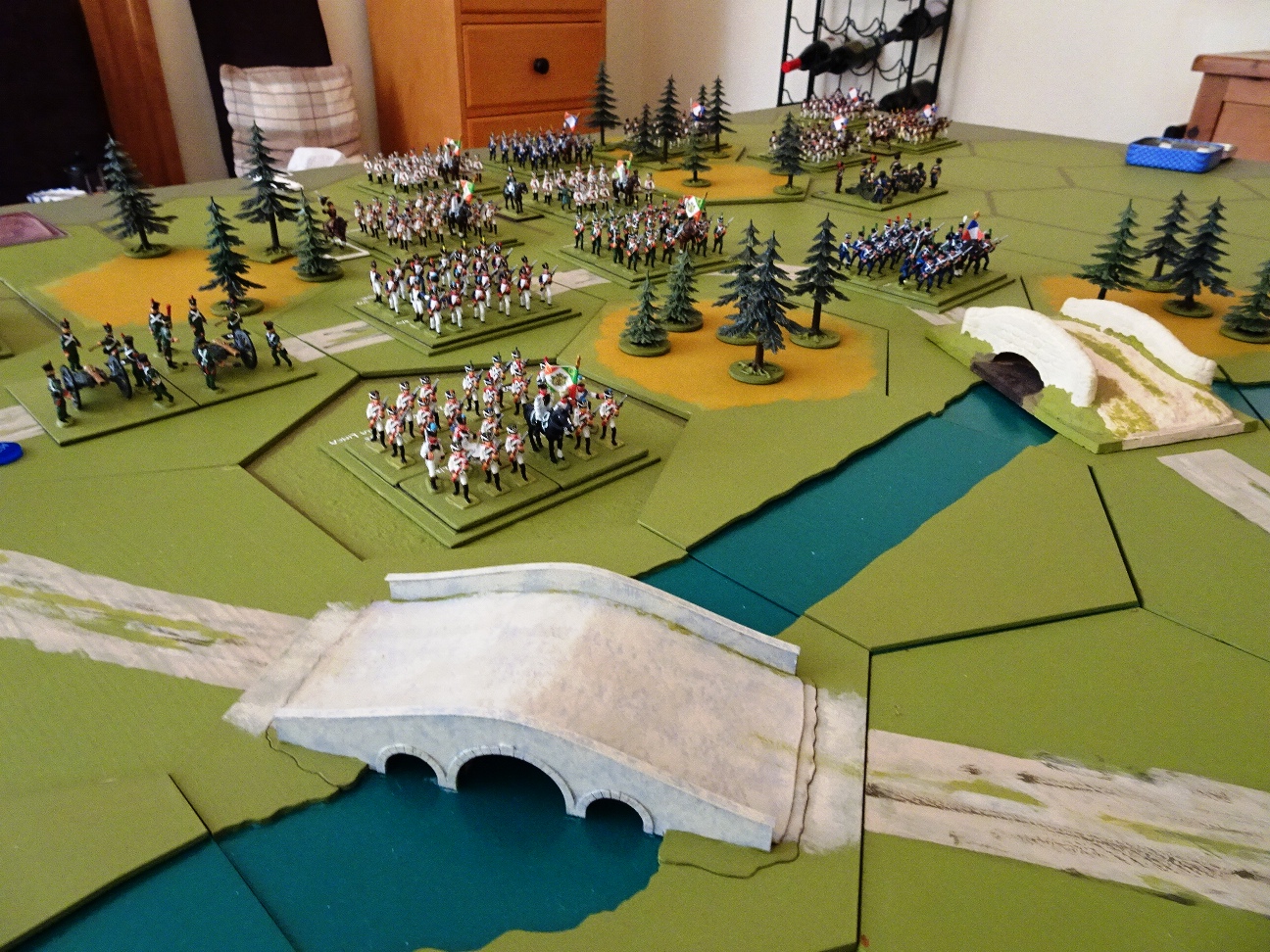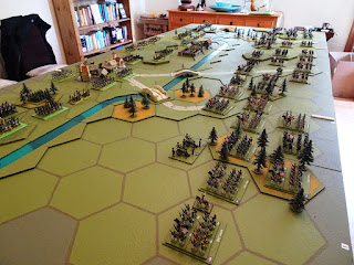 Interesting the extent to which the game differed from (and, in parts, was similar to) the original battle. The struggle to get across the river, the formidable obstacle offered by the walled farm behind the central section of the river, and the to-and-fro struggles on the Austrian right and centre each had their own special moments.
